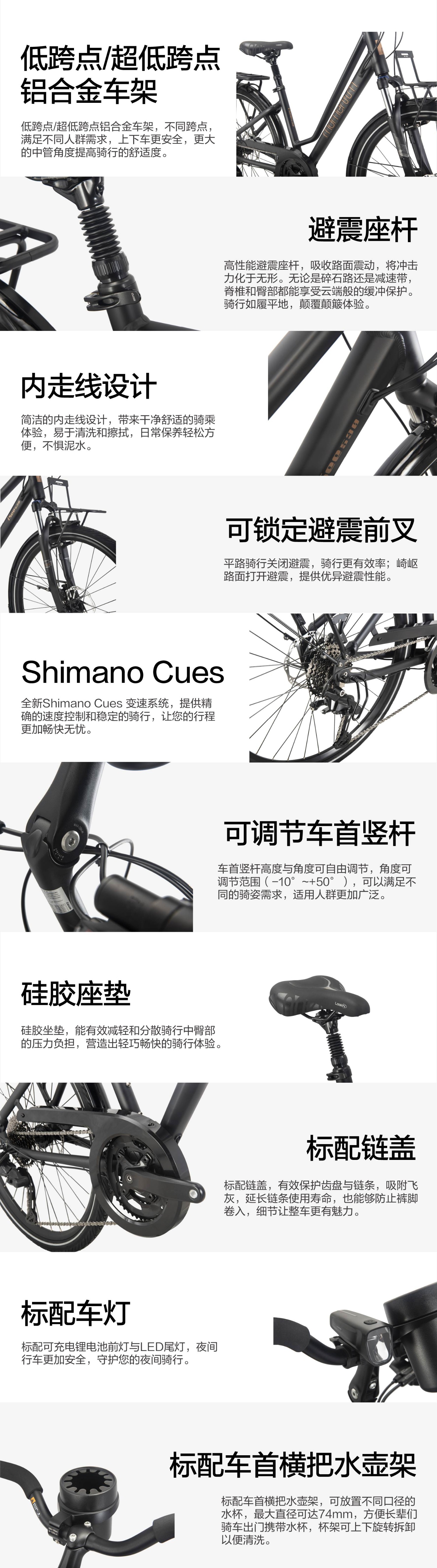 其他 | 标配前后铝合金货架,铝合金停车架,前后泥除,链盖,可充电锂电池前灯; |
